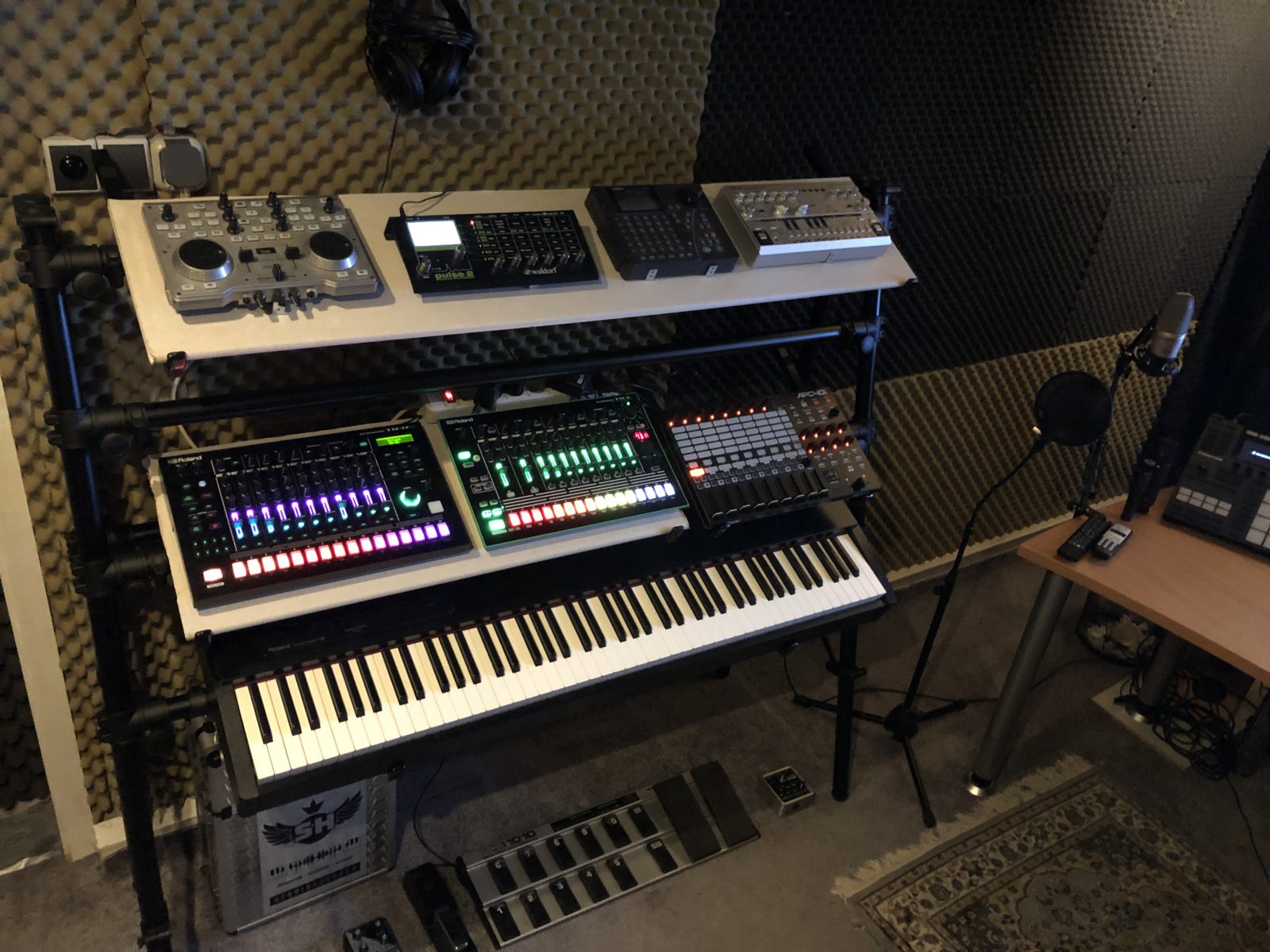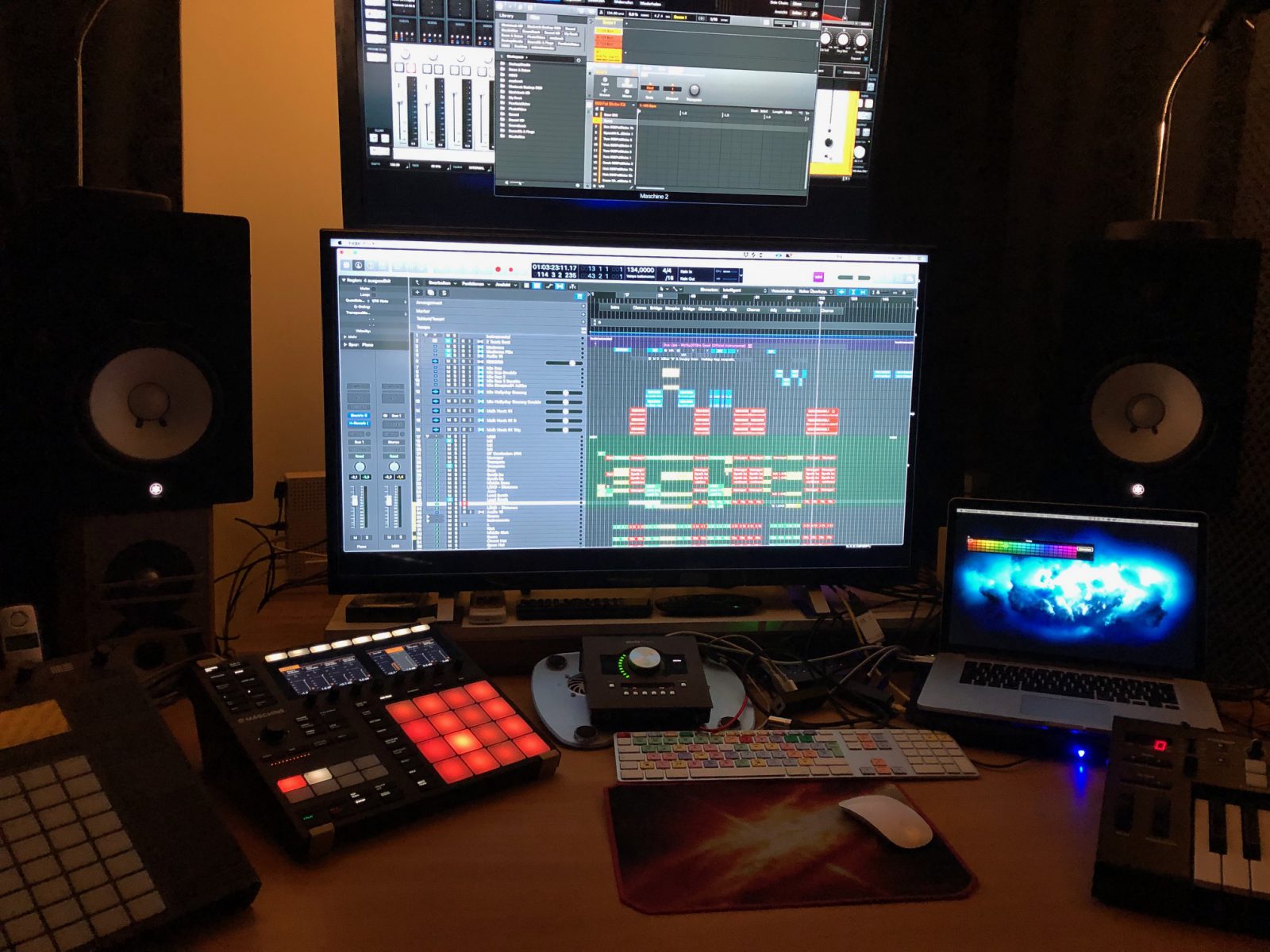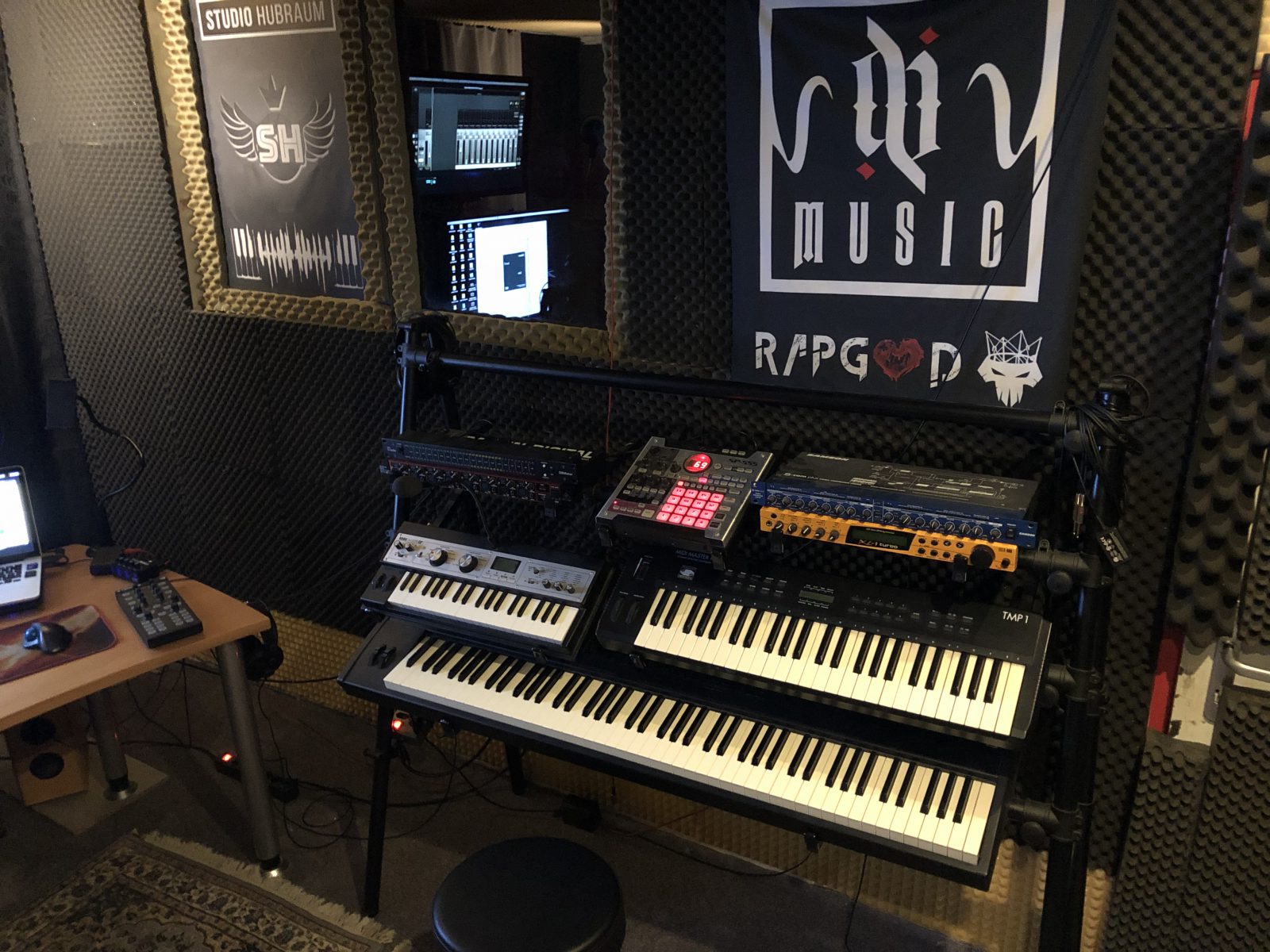 Wir arbeiten unter anderem mit Audio Interface UAD Apollo, Logic Pro X, Ableton, StudioOne, Waves, Ableton Push 2, Kurzweil PC88MX, Roland TR-8, Novation, Maschine, TD-3 , Kork Microwave, Waldorf Pulse plus E-Drums und mit natürlich sehr umfangreichen Softwarekomponenten (virtuelle Klangerzeuger, UAD,  Synthesizer, Micro Neumann, Drum -Sequenzern und weiteren wichtigen FX-Plugins) . So holen wir aus den gegebenen